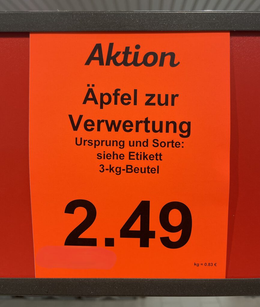 Bisher hatte ich Äpfel gegessen, jetzt soll ich sie verwerten. Vorsichtshalber frage ich nach beim Supermarkt-Mitarbeiter, was ich als Verwerter beachten muss. Der junge Mann weiß es auch nicht, er sehe das Schild auch zum ersten Mal. Und dabei ist es in Rot und mit „Aktion“ überschrieben.