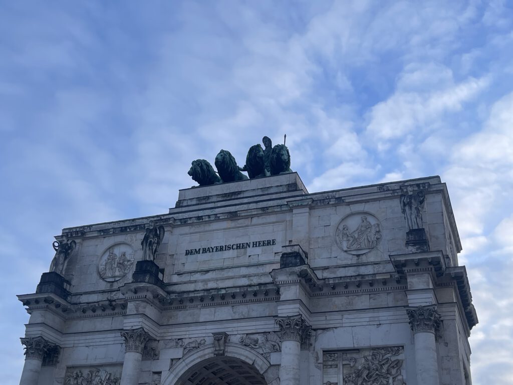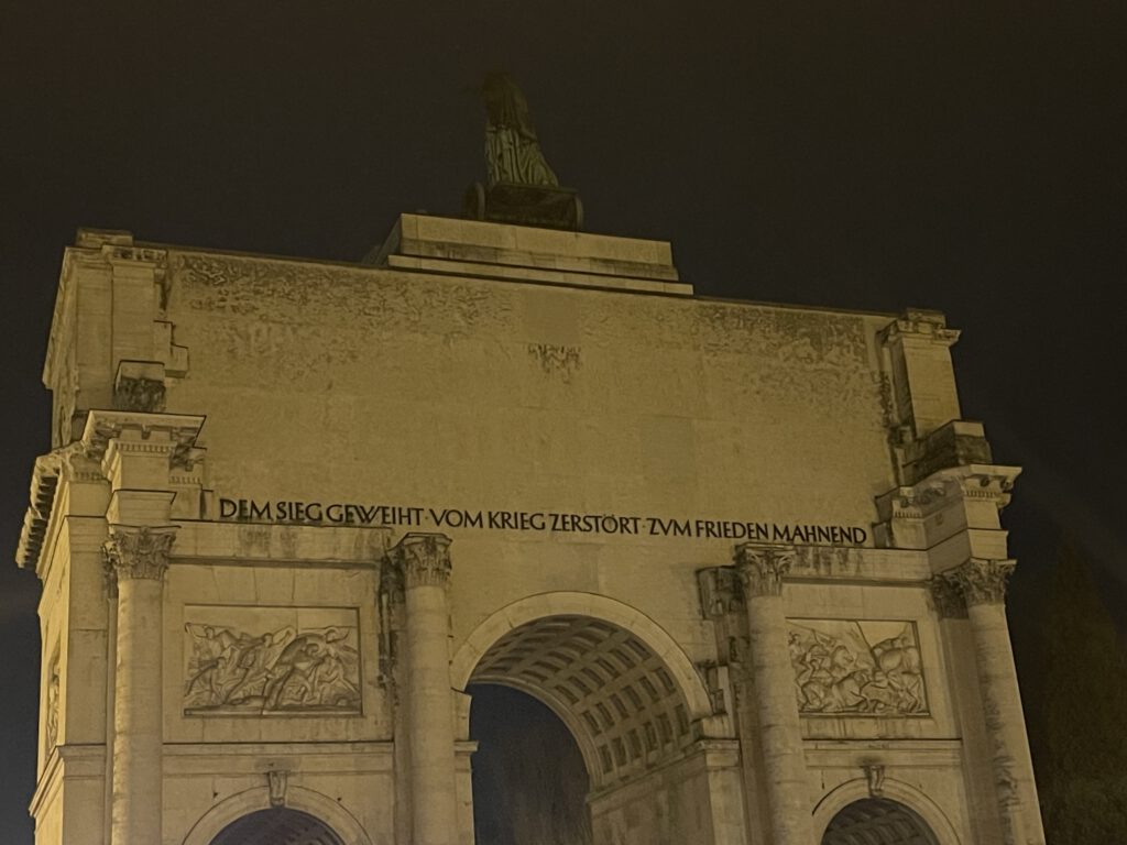 In München steht nicht nur ein Hofbräuhaus, sondern auch ein Siegestor. Es erinnert ein wenig an das Brandenburger Tor in Berlin. Auf dem Dach gibt es auch eine Quadriga, allerdings eine mit Löwen. In Berlin sind es Pferde. Ich weiß gar nicht, wem das Brandenburger Tor geweiht ist. Beim Siegestor ist es klar. Es ist „Dem Bayrischen Heere“ geweiht, so wie der Reichstag „Dem Deutschen Volke“. So wei(h)t, so gut. Erwähnt sei auf jeden Fall noch der Hinweis auf der Rückseite (unten) des Siegestores. Ich verstehe ihn so, dass auf jeden Sieg eine Zerstörung folgt – Mahnung hin oder her. Mich erinnert das an „Alles wird besser“, ein Song von Silly – „Die Top Band aus der DDR“.